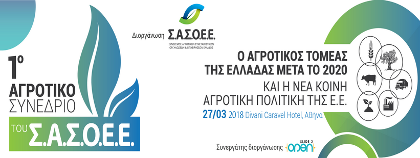 Ένα χρόνο μετά τη σύστασή του, ο Σύνδεσμος Αγροτικών Συνεταιριστικών Οργανώσεων και Επιχειρήσεων Ελλάδος (Σ.Α.Σ.Ο.Ε.Ε.) διοργανώνει το 1ο Αγροτικό Συνέδριο του Σ.Α.Σ.Ο.Ε.Ε., με θέμα «Ο Αγροτικός Τομέας της Ελλάδας μετά το 2020 και η Νέα Κοινή Αγροτική Πολιτική της Ε.Ε». Το Συνέδριο θα πραγματοποιηθεί την Τρίτη, 27 Μαρτίου 2018, ώρες 09.00 π.μ. έως 18.30 μ.μ., στο ξενοδοχείο Divani Caravel, στην Αθήνα.