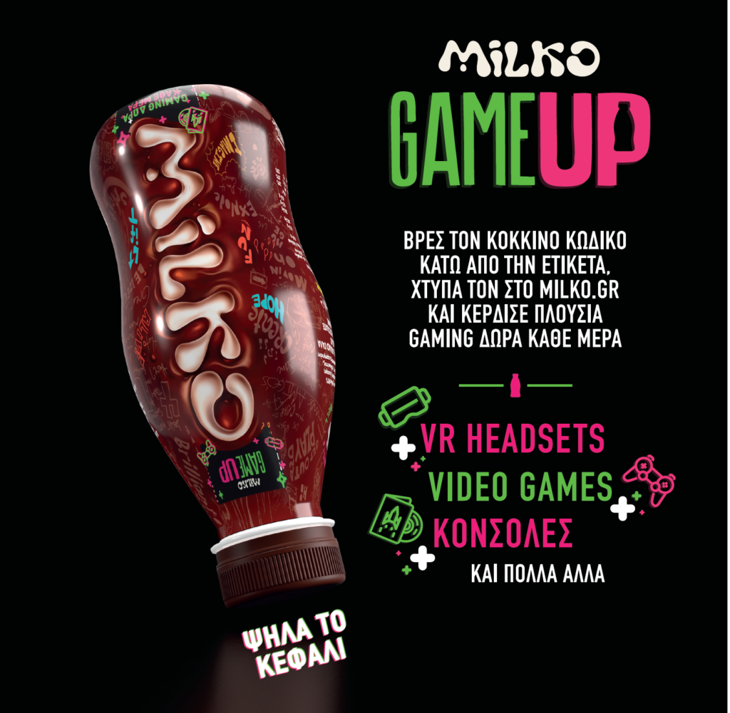 Στο πλαίσιο της καμπάνιας Game-Up, το Milko καλεί τους καταναλωτές να ανακαλύψουν τον τυχερό κωδικό στη συσκευασία, κάτω από την ετικέτα του μπουκαλιού 500ml και να τον καταχωρήσουν στο milko.gr, για να μάθουν στη στιγμή αν είναι από τους gamers, που κερδίζουν καθημερινά φανταστικά δώρα τεχνολογίας, δίνοντας άλλη διάσταση στο Gaming. Οι τυχεροί καταναλωτές θα έχουν την ευκαιρία να κερδίσουν Κονσόλες PS4, VR Headsets, Video Games και πολλά άλλα δώρα!