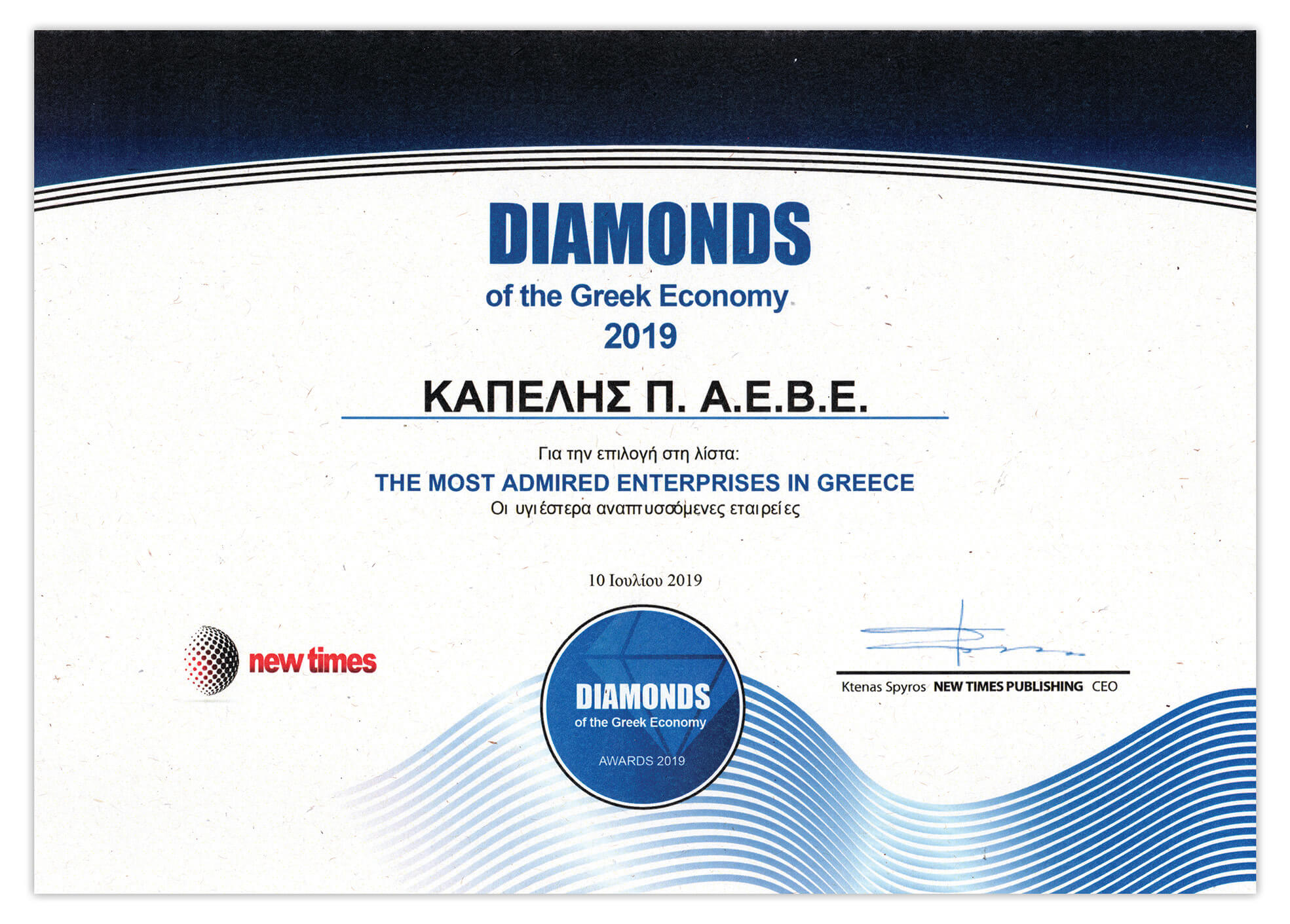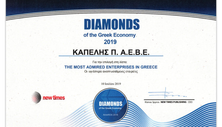 Η Kapelis Packaging διακρίθηκε ανάμεσα στις δυναμικότερες Ελληνικές επιχειρήσεις και βραβεύτηκε ως ‘Diamond of the Greek Economy 2019’ για την υγιή και αναπτυσσόμενη επιχειρηματική της δραστηριότητα.