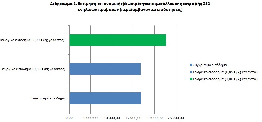 Σύμφωνα με στοιχεία της Ελληνικής Στατιστικής Αρχής, το κατά κεφαλήν εθνικό εισόδημα στην Ελλάδα διαμορφώθηκε στις 16.768,66 € σε αγοραίες τιμές του έτους 2017. Η πιο πάνω σύγκριση και ταξινόμηση αποτυπώνεται στο Διάγραμμα 1 (με επιδοτήσεις). Οι εκμεταλλεύσεις υπό το δυσμενές σενάριο, το οποίο αντικατοπτρίζει το νέο περιβάλλον τιμών βρίσκονται λίγο πιο κάτω από το μέσο εισοδηματικό όριο. Από την ανάλυση που προηγήθηκε φαίνεται ότι η μείωση στην τιμή του γάλακτος οδηγεί σε σημαντική φθίνουσα πορεία του γεωργικού εισοδήματος.