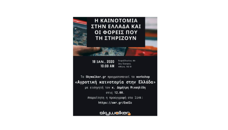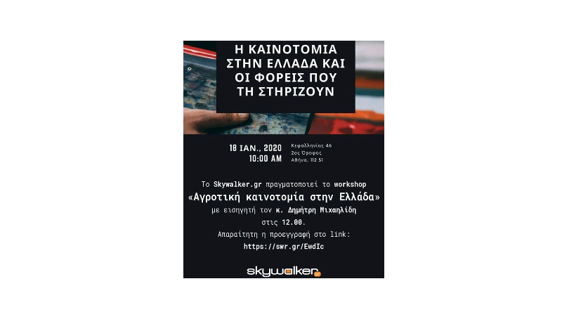 Το Σάββατο, 18 Ιανουαρίου 2020, στις 12.30, στο Athens Center for Entrepreneurship & Innovation – ACEin του Οικονομικού Πανεπιστημίου Αθηνών, Κεφαλληνίας 46 (2ος όροφος), στο πλαίσιο του «Η καινοτομία στην Ελλάδα και οι Φορείς που την στηρίζουν» οργανώνεται από το Skywalker και τις εκδόσεις Στέντορας εργαστήριο για την «Αγροτική Καινοτομία στην Ελλάδα» με υπεύθυνη την Γ. Κωνσταντίνου και συντονιστή τον Δημ. Μιχαηλίδη.