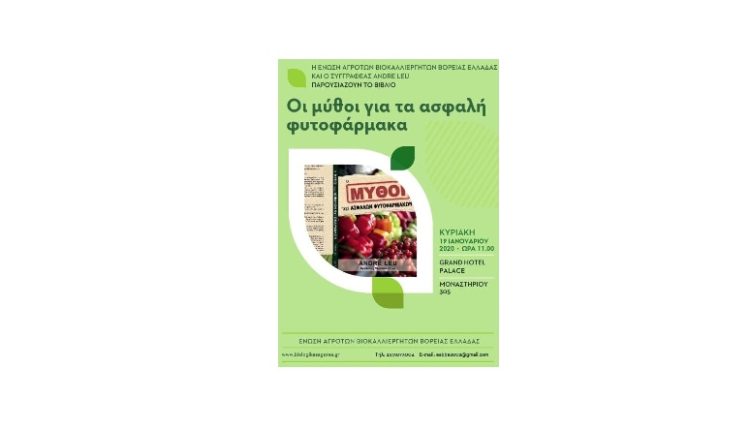 Την Κυριακή, 19 Ιανουαρίου 2020, στις 11.00, στην αίθουσα «Ολυμπία Α» του Grand Hotel Palace (Θεσσαλονίκη), οργανώνεται βιβλιοπαρουσίαση και συζήτηση με θέμα «Οι μύθοι περί των ασφαλών φυτοφαρμάκων», από την Ένωση Αγροτών Βιοκαλλιεργητών Βορείου Ελλάδος.