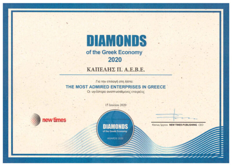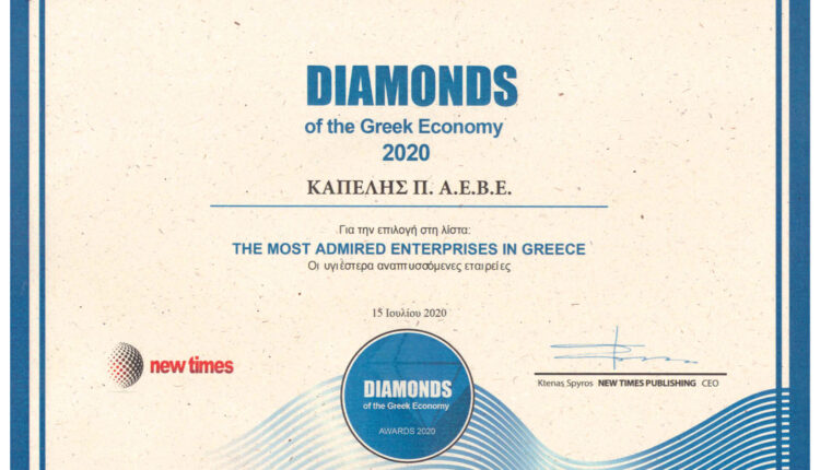 Η Kapelis Packaging διακρίθηκε ανάμεσα στις δυναμικότερες eλληνικές επιχειρήσεις και βραβεύτηκε ως “Diamond of the Greek Economy 2020” για την υγιή και αναπτυσσόμενη επιχειρηματική της δραστηριότητα.