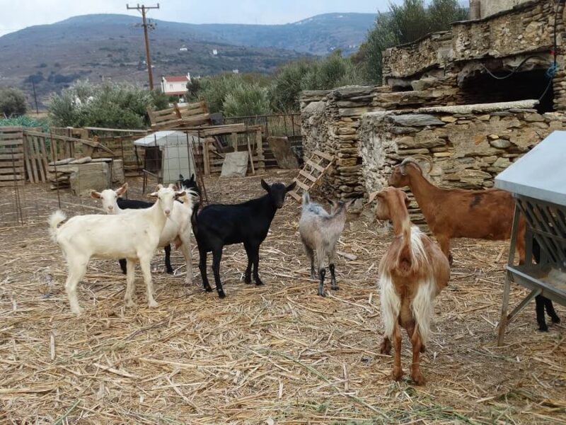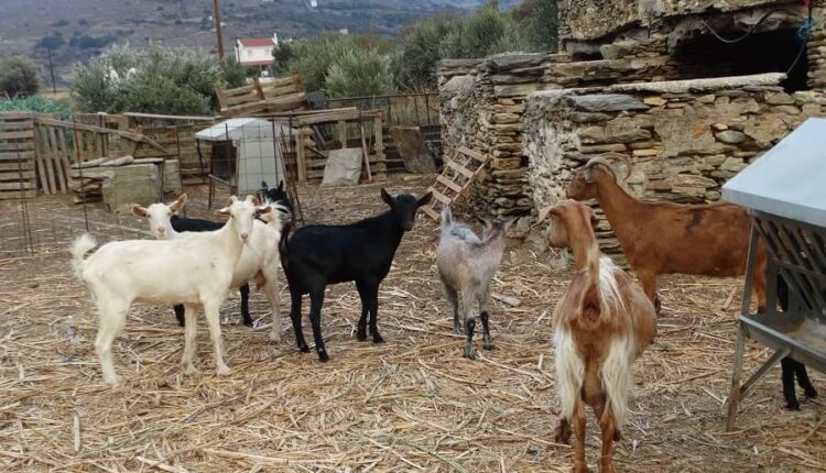 Κεντρική φωτογραφία: Κατσίκες στην κτηνοτροφική μονάδα των αδελφών Ζαγοραίου στο Κόρθι της Άνδρου. Φωτογραφία: Εν Άνδρω.
