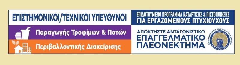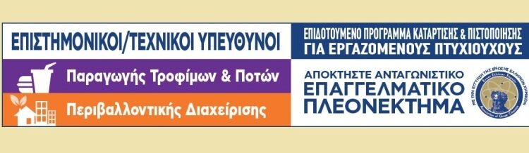 Η Ένωση Ελλήνων Χημικών ως Δικαιούχος της ενταγμένης Πράξης «Κατάρτιση και Πιστοποίηση Επιστημονικών/Τεχνικών Στελεχών στη Βιομηχανία Τροφίμων και την Περιβαλλοντική Διαχείριση» με κωδικό ΟΠΣ 5003030, η οποία υλοποιείται στο πλαίσιο του Ε.Π. Ανταγωνιστικότητα, Επιχειρηματικότητα και Καινοτομία 2014-2020, του Υπουργείου Οικονομίας και Ανάπτυξης καλεί τους εργαζόμενους του ιδιωτικού τομέα (ανεξαρτήτως του κλάδου απασχόλησης) και στις 13 Περιφέρειες της χώρας, να υποβάλλουν αίτηση συμμετοχής σε ένα σημαντικό έργο κατάρτισης.
