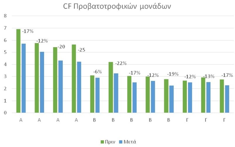 Διάγραμμα 1. Το αποτύπωμα του άνθρακα (CF) του πρόβειου γάλακτος, πριν και μετά την εφαρμογή ορθών πρακτικών μείωσης των εκπεμπόμενων αερίων του θερμοκηπίου.