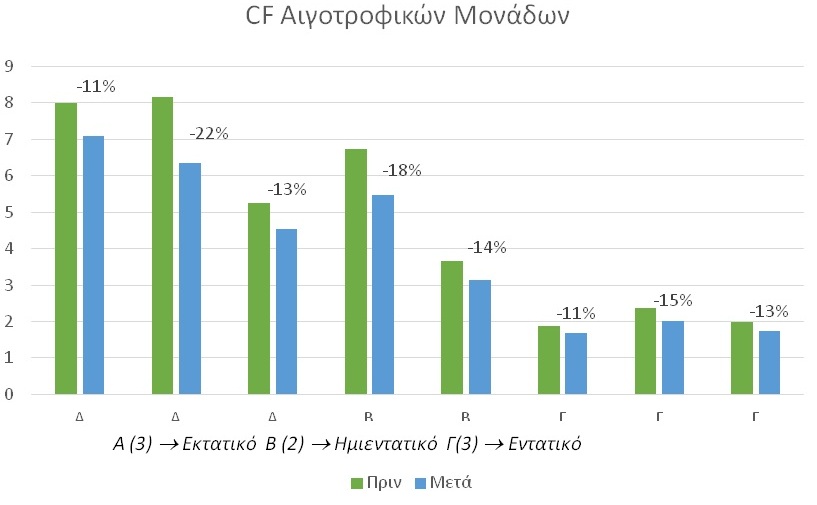 Διάγραμμα 2. Το αποτύπωμα του άνθρακα (CF) του αίγειου γάλακτος, πριν και μετά την εφαρμογή ορθών πρακτικών μείωσης των εκπεμπόμενων αερίων του θερμοκηπίου