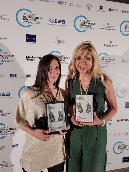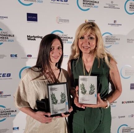 Κεντρική φωτογραφία (από αριστερά): Τα στελέχη της ΔΕΛΤΑ Δήμητρα Καλπακτσή (Group Brand Manager Milk Drinks & Life) και Αλεξάνδρα Βασιλακοπούλου (Διευθύντρια Εταιρικής Επικοινωνίας) κατά την παραλαβή των βραβείων Responsible Business 2021.
