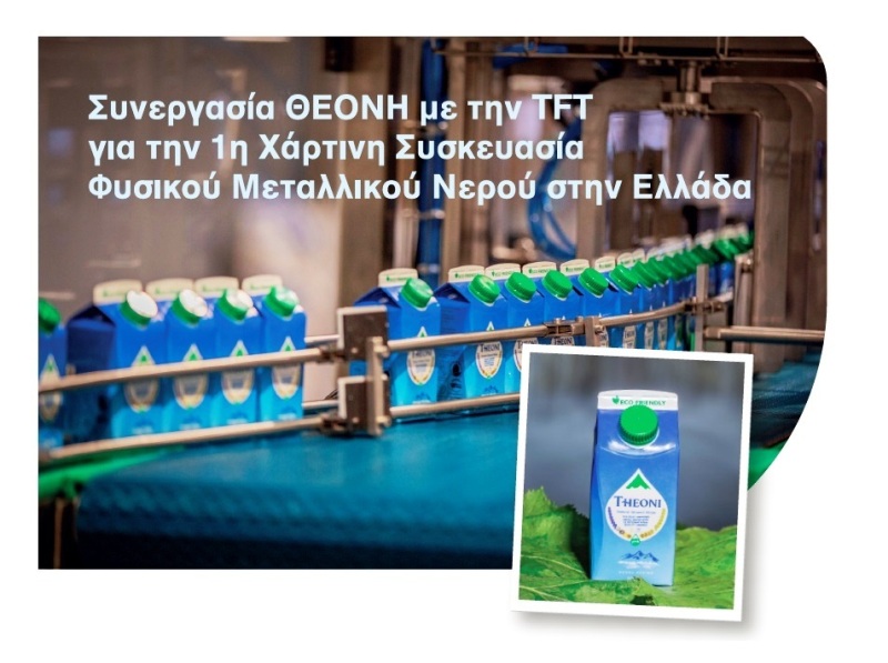 Η ομάδα έμπειρων μηχανικών της TFT, σε συνδυασμό με τον κορυφαίο εξοπλισμό των GALDI και GAMPACK και των χαρτοκυτίων ELOPACK, που αντιπροσωπεύει στην Ελλάδα, και με τη συνεργασία της πεπειραμένης τεχνικής ομάδας της ΘΕΟΝΗ ΑΕ, ολοκλήρωσαν και παρέδωσαν την υψηλών προδιαγραφών γραμμή συσκευασίας και επισυσκευασίας του φυσικού μεταλλικού νερού ΘΕΟΝΗ, το 1ο και μοναδικό φυσικό μεταλλικό νερό στην Ελλάδα σε χάρτινη, 100% ανακυκλώσιμη συσκευασία. Η χάρτινη αυτή συσκευασία της εταιρίας ELOPACK είναι πιστοποιημένη από την Διεθνή Οργανισμό FSC, ενώ η πρώτη ύλη προέρχεται από υπεύθυνα διαχειριζόμενα δάση.