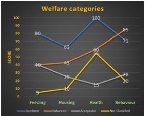 Στο παρακάτω Διάγραμμα 3, παρουσιάζεται η τελική αξιολόγηση τεσσάρων εκτροφών αγελάδων γαλακτοπαραγωγής ως προς τις 4 βασικές παραμέτρους: διατροφή (Feeding), στέγαση (Housing), υγεία (Health) και συμπεριφορά (Behaviour), με τις αντίστοιχες εκτροφές να βαθμολογούνται (Score) από εξαιρετικές (Excellent) έως μη αποδεκτές (notclassified), ανάλογα με τις συνθήκες εκτροφής και διαχείρισης του ζωικού τους κεφαλαίου. Στο Διάγραμμα 4, παρουσιάζεται, επίσης, η τελική αξιολόγηση ευζωίας της μονάδας προβάτων της γαλακτοβιομηχανίας ‘ΗΠΕΙΡΟΣ’, με μέση βαθμολογία 97% και ανθρακικό αποτύπωμα του γάλακτος 2,24 KgCO2 / Kg.