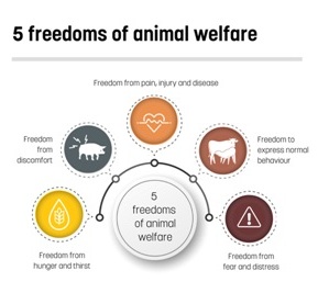 | Ελευθερία για εκδήλωση κανονικής συμπεριφοράς. Φροντίδα για εξασφάλιση επαρκούς χώρου, κατάλληλου εξοπλισμού και συντροφιάς από ζώα του ίδιου είδους | Επιθετική συμπεριφορά, απομόνωση,