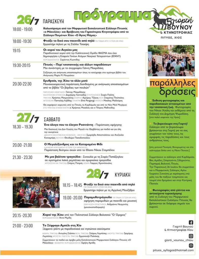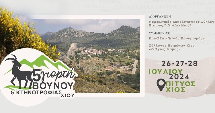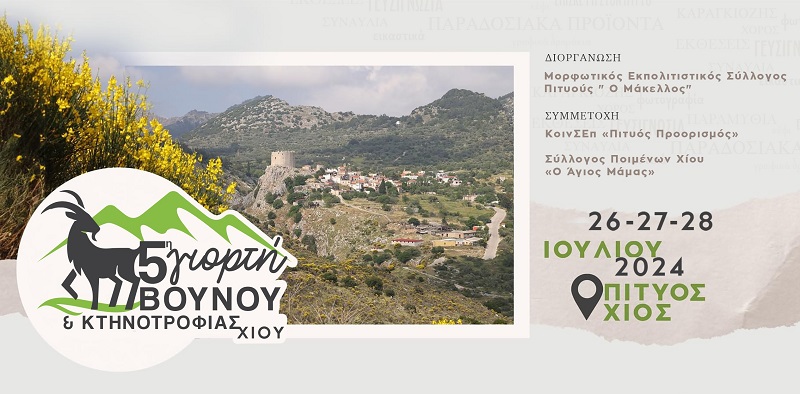 Μορφωτικός Εκπολιτιστικός Σύλλογος Πιτυούς «Ο Μάκελλος» σε συνδιοργάνωση με το Δήμο Χίου και με τη συμμετοχή της ΚΟΙΝΣΕΠ Πιτυός-Προορισμός και του Συλλόγου Ποιμένων Χίου «Ο Άγιος Μάμμας», διοργανώνουν για πέμπτη φορά τη Γιορτή Βουνού και Κτηνοτροφίας Χίου το τριήμερο 26, 27, 28 Iουλίου 2024.