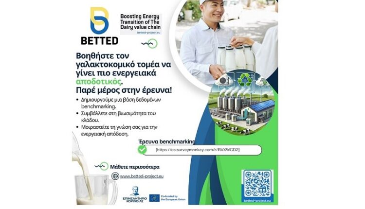 Το Επιμελητήριο Κορινθίας, στο πλαίσιο της συμμετοχής του στο έργο BETTED (Boosting Energy Transition of ThE Dairy Value Chain), καλεί τις επιχειρήσεις τροφίμων που δραστηριοποιούνται στον γαλακτοκομικό τομέα να λάβουν μέρος σε μια σημαντική πρωτοβουλία για τη βιωσιμότητα και την ενεργειακή αποδοτικότητα.